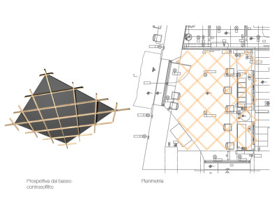 Anche il controsoffitto è in legno naturale, un telaio senza pannellatura ruotato di 45 gradi rispetto all’ambiente da cui scendono i corpi luminosi. Frontalmente Il menu display retroilluminato fluttua sospeso sopra il bancone in microcemento su cui si lavora e si consuma al tempo stesso. Come in un fast-diner americano o in un sushibar la lavorazione del cibo (e l’intera cucina) è completamente a vista e avviene al di là di un divisorio vetrato rispetto alla mensola su cui si mangia. Nonostante si tratti di un fast food abbiamo previsto tutti gli accorgimenti necessari a rendere l’esperienza del consumatore avvolgente, il bancone è dotato di asta poggiapiedi, ganci appendiabiti e prese usb per la ricarica di smartphone, gli sgabelli sono comodi e imbottiti, l’illuminazione efficace ma puntuale e quindi più intima, la musica con una radio dedicata.